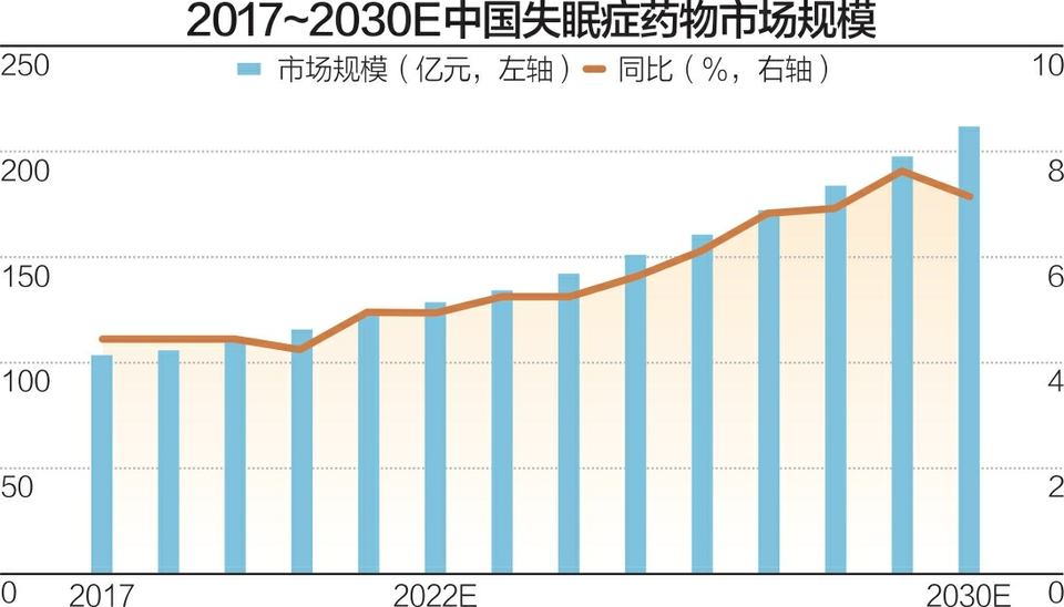 咨询公司弗若斯特沙利文发布的报告预测,中国失眠症患者数量将从2017年的2.5亿人增长至2030年的3.3亿人,年复合增长率为2.9%。