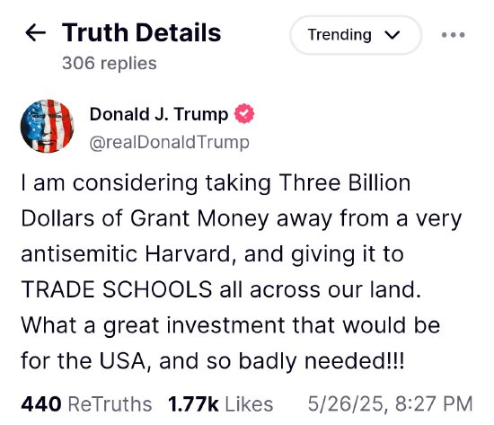 北京时间5月26日晚间消息,美国总统特朗普在社交媒体上表示,正在考虑从哈佛大学撤回30亿美元的资助资金,并将其重新分配给美国各地的其他学校。