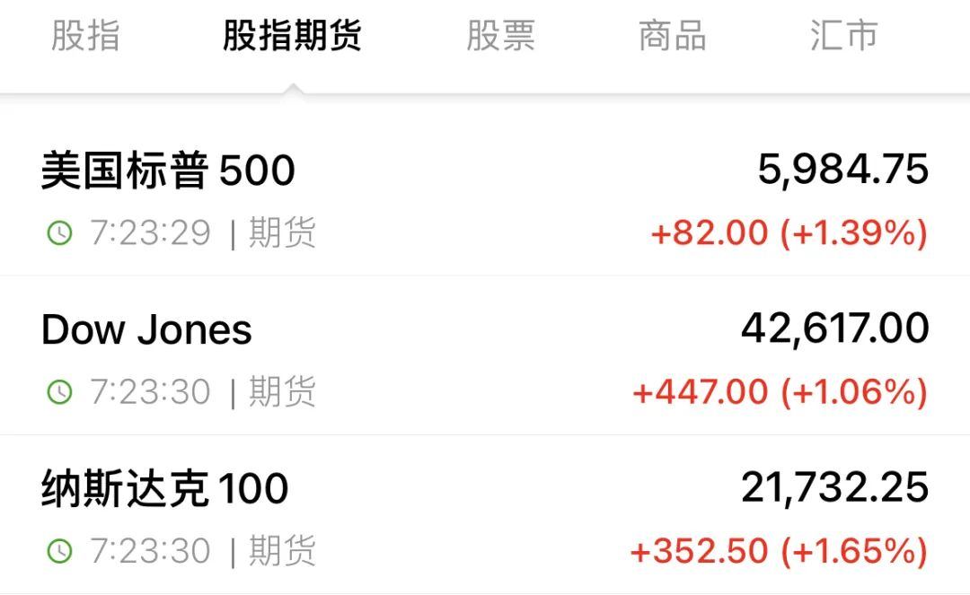 美股期指涨幅扩大,纳指期货涨幅扩大至1.65%,标普500指数期货涨幅扩大至1.39%,道指期货涨1.06%。