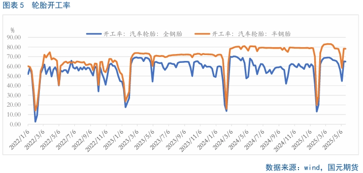 2025年1-4月份,虽然国内的天然橡胶和合成橡胶进口量高企,供应压力走高。据统计,2025年1-4月我国进口天然及合成橡胶(含胶乳)共计286.9万吨,较2024年同期的232.9万吨增加23.2%。4月当月,国内进口天然及合成橡胶(含胶乳)合计68.5万吨,较2024年同期的52.3万吨增加31%。但是在全球割胶淡季的背景下,5月初中美经贸高层会谈取得实质性进展,因此导致下游轮胎市场呈现出“抢出口”预期,使得5月份国内的天胶库存呈现出明显的去库趋势。据统计,截至2025年5月25日,国内天然橡胶社会库存130.8万吨,较5月初下滑0.39万吨,降幅3.32%,去库速度加快。从后期来看,当前“抢出口”逐渐降温,市场又回归至供需基本面,考虑到“贸易战”仍在持续的发酵,且波及国家众多,或将进一步抑制全球的消费需求,因此或将制约后期国内天胶的去库速度。