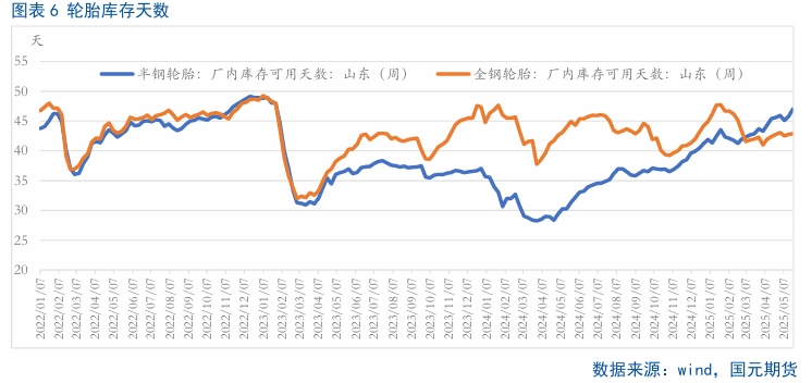 5月份受五一长假的影响,国内轮胎装置开工率呈现明显的回落,叠加贸易战的背景下,市场对于需求端存在收缩的预期,因此当月轮胎的装置开工率均值小于2024年同期。据悉,截至5月22日,国内全钢胎和半钢胎的当月装置开工率分别在57.77%和71.83%,分别较4月均值下滑了2.68和4.55个百分点,较去年同期下滑7.37和7.38个百分点。虽然五一过后,中美贸易取得阶段性的缓和,市场存在“抢出口”的预期,但是需求端整体乏力,使得宏观利好全部释放完后,市场又回归至基本面。在此影响下,轮胎库存天数呈现出回升局面,尤其是半钢胎厂内库存大幅攀升。据统计,5月22日当周,国内半钢胎和全钢胎的厂内库存天数分别达到47和42.86天,较4月底分别上涨1.4和0.13天。从后期来看,此次贸易商波及国家众多,且时间较长,因此该政策对后期全球的需求或将呈现一定的萎缩,所以终端消费并不乐观,拖累国内轮胎的内需和出口,所以进一步对上游市场形成一定的负反馈。