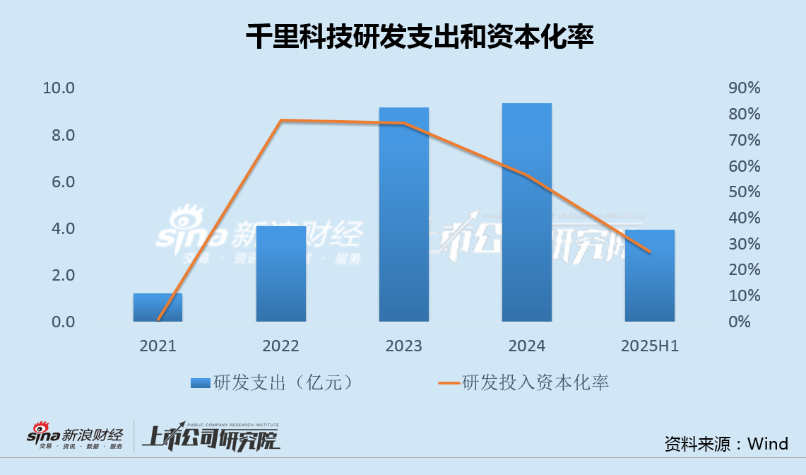 需要注意的是,千里科技还将相当一部分研发投入长期进行资本化处理,不计入当期损益,2022年至2024年的比例均超过50%,显著高于可比公司,存在粉饰业绩的可能性。