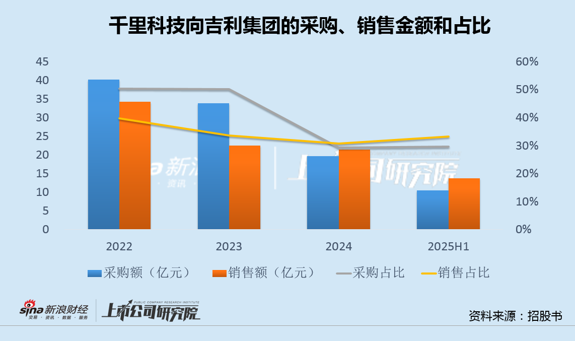 招股书显示,2022年、2023年、2024年和2025年前6个月,吉利集团的合计采购金额分别为40.22亿元、33.87亿元、19.63亿元及10.49亿元,分别占千里科技同期采购总额的50.4%、50.1%、29.3%及29.7%。