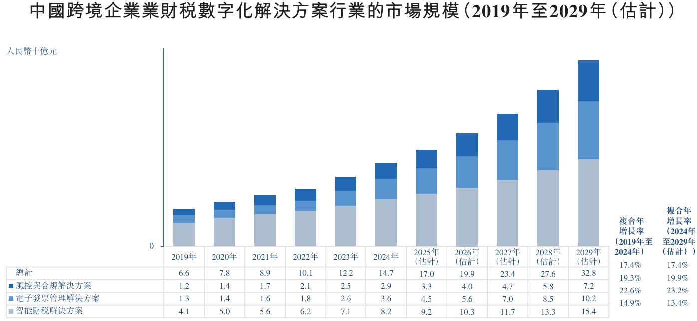根据弗若斯特沙利文,得益于中国不断扩大的全球贸易、日益增长的对外投资及日趋复杂的国际税收法规,中国跨境企业财税数字化解决方案行业快速增长。市场规模从2019年的人民币66亿元增长至2024年的人民币147亿元,复合年增长率为17.4%。展望未来,预计到2029年,该行业将保持增长态势,市场规模达到人民币328亿元。
