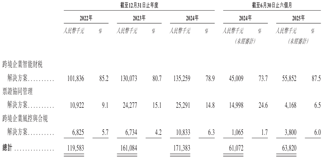 根据招股书介绍,擎天全税通的跨境企业财税数字化综合解决方案,涵盖了跨境企业智能财税解决方案、票证协同管理解决方案以及跨境企业风控与合规解决方案,实现了跨境企业财税全场景业务覆盖。其中智能财税解决方案为公司的主要业务,占公司总营收的比率约80%。