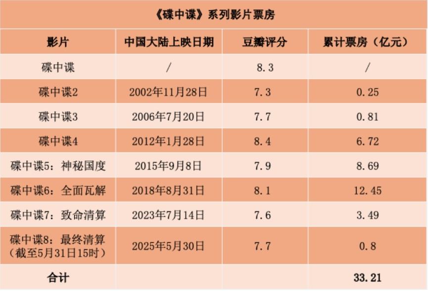 据证券时报记者统计,截至目前,包括第8部在内,《碟中谍》系列影片在国内的总票房已经超过33亿元。其中,2018年8月31日上映的《碟中谍6:全面瓦解》,取得超过12亿元票房。