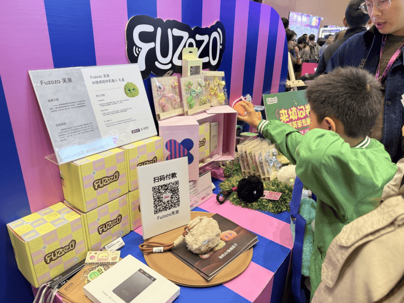 同样火热的展台还有珞博智能的Fuzozo芙崽展台。据了解,芙崽是一款以AI大模型为底座的情感陪伴潮玩,外形是一个小巧的毛绒挂件,方便随身携带,也是一款主打“长期养成”的AI伙伴。芙崽定价在399元左右,现场不少带着孩子的家长纷纷下单。