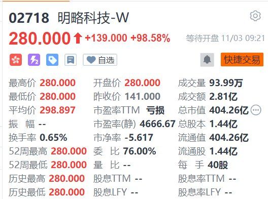 明略科技-W(2718.HK)今日首日上市高开98.58%,报280港元,市值超400亿港元。该股IPO定价141港元/股,公开发售获4452.86倍认购,国际配售获13.93倍认购。