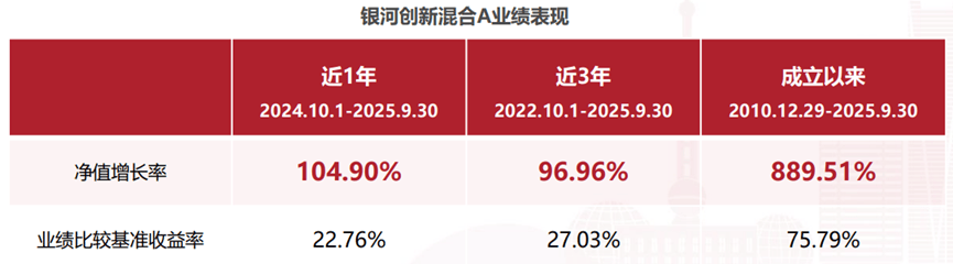 更为引人注目的是其业绩表现――截至2025年9月30日,银河创新混合A近一年净值增长率高达104.90%,近三年累计净值增长率达96.96%,自2010年12月成立以来至2025年9月30日更是实现了889.51%的回报。这一成绩显著超越其业绩比较基准,凸显了基金管理人主动管理能力的实力。