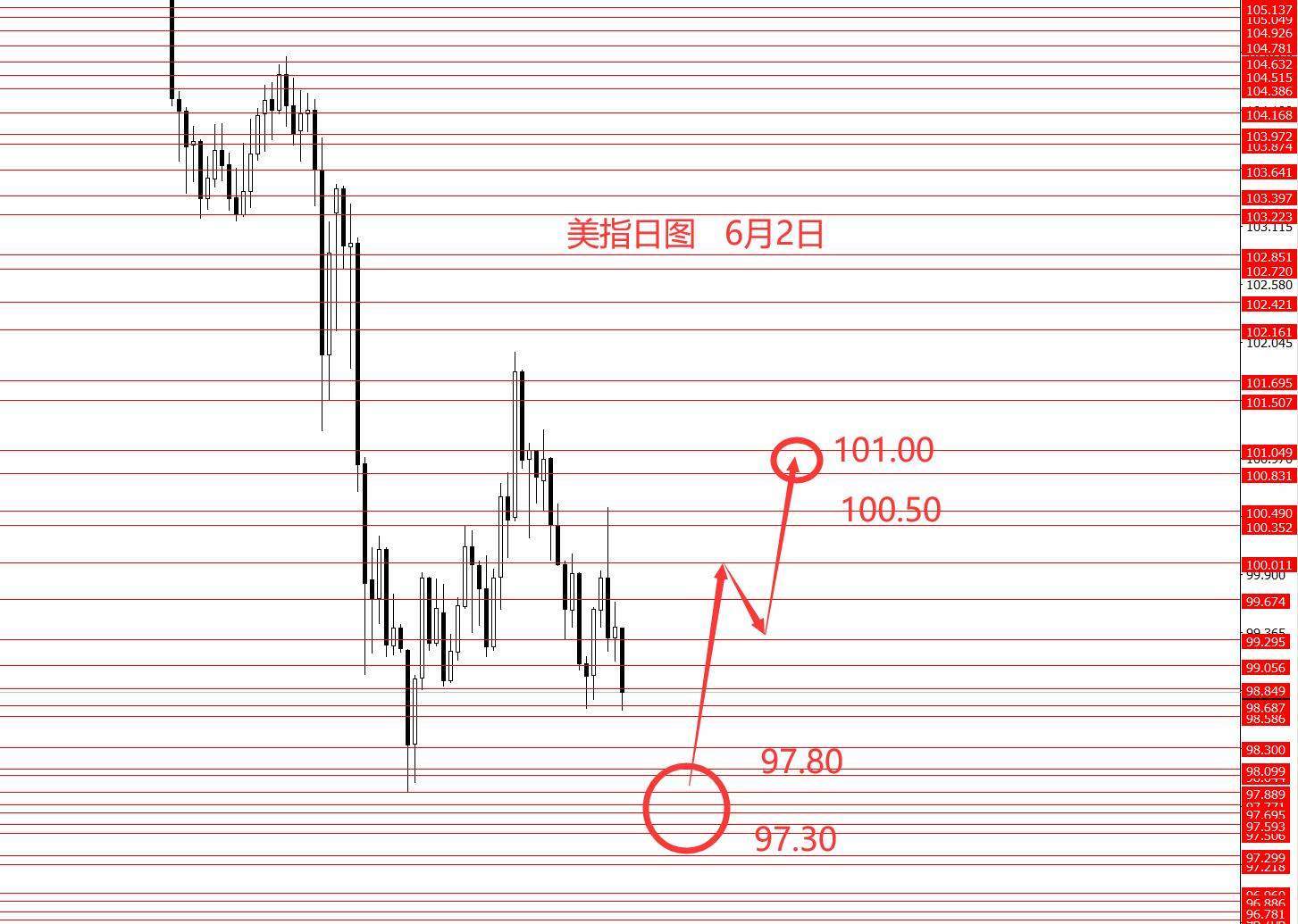 美指上周正如预期反弹至100.50,之后承压下行,周图收小阳柱。从图形来看,五月收盘较低,但也不影响后市继续区间震荡的格局,从1月13日开始下跌至4月22日中线下跌波段整整三个月,目前底部震荡时间周期不够,后市继续在97.30-101.00区间震荡的概率较大些,备选方案才是99.30以下直跌至95.80区域。本周目前短线还是下跌趋势,重点关注97.80和97.30两个强支撑区域,以上留意再次反转信号出现,出现后右侧短线做多,按日线级别低位区间震荡格局操作,灵活应对。今日和上周一样,只有大概框架思路,没有具体操作建议。