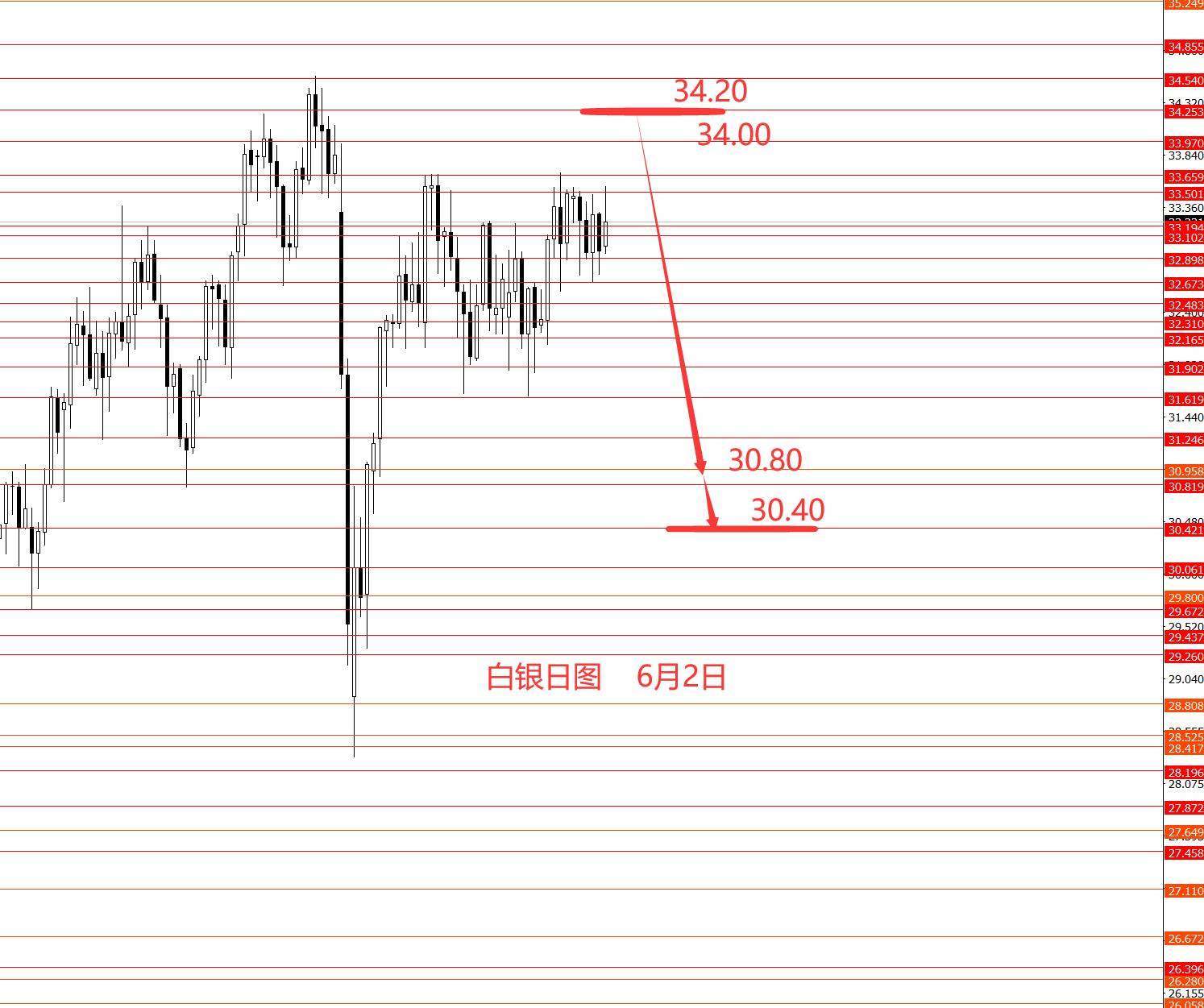 白银上周仍在区间内震荡,周图收中阴柱。从图形来看,白银长线仍是高位宽帐震荡格局,震荡区间35.00至26.40。中线行情关注下跌波段,上方强阻力关注34.20区域转折点。由于离上方强阻力比较近,所以近期涨跌都有限,本月建议逢高做空白银。激进者操作策略:34.20区域做空,止损34.80,目标看向30.80和30.40区域。控制仓量,严格止损。