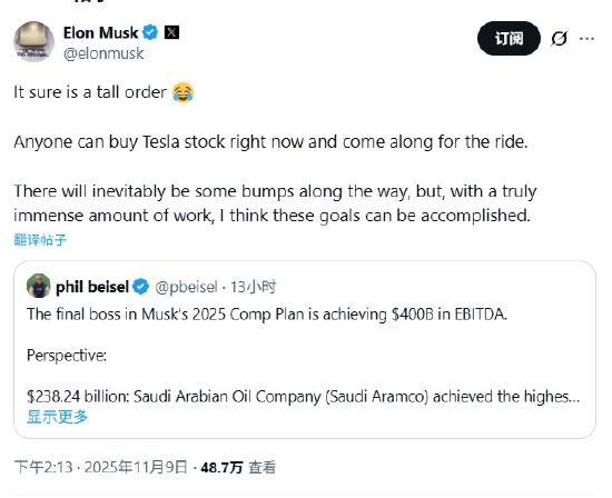 他转发了一条贴文,其中提到:“马斯克2025年薪酬计划的‘终极目标’是实现4000亿美元息税折旧摊销前利润(EBITDA)。2382.4亿美元——这是沙特阿拉伯国家石油公司(沙特阿美)2022年创下的史上最高年度EBITDA。彼时受全球油价高企、销量增长、地缘政治紧张及疫情后需求复苏推动,该公司炼油利润率表现强劲。这一数字远超埃克森美孚(2022年为1025.9亿美元)、英伟达(2024财年为344.8亿美元)等其他巨头企业。”