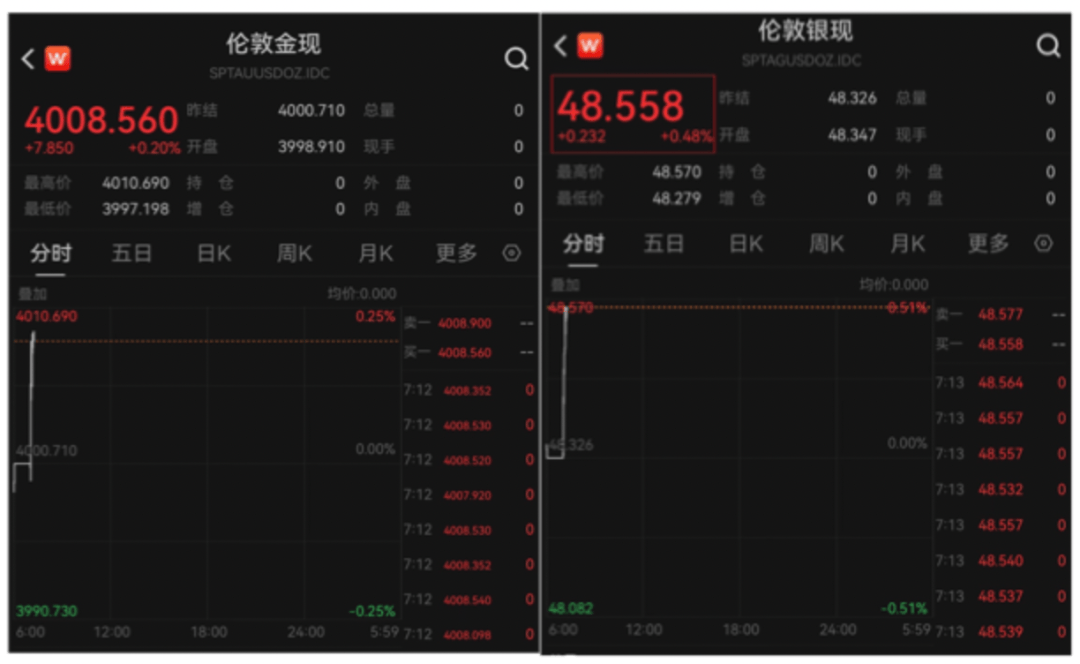 现货黄金开盘后直线拉升。截至发稿,现货黄金报4008.56美元/盎司,现货白银报48.558美元/盎司,涨幅分别为0.2%、0.48%。