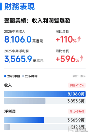 公告显示,捷利交易宝2025年中期实现收入8,106万港元,同比增长110%;净利润3,566万港元,同比飙升596%,展现出强劲的增长动能与财务质量。