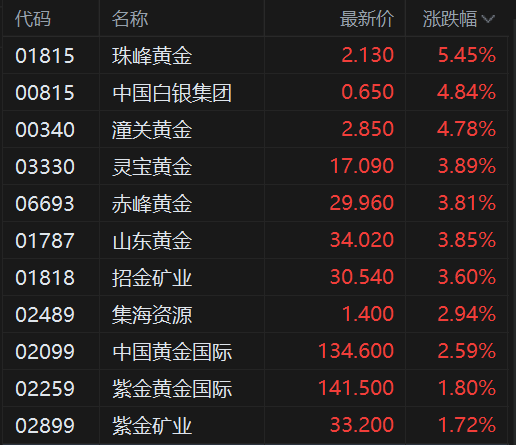 港股黄金股普遍拉升上涨,其中,珠峰黄金涨5.5%,潼关黄金涨约5%,灵宝黄金、赤峰黄金、山东黄金、招金矿业均涨近4%,中国黄金国际、紫金黄金国际、紫金矿业跟涨。