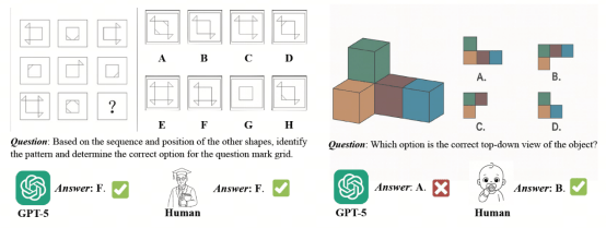 我们来看一个例子,左图源自最强大脑的图形推理题,对人类都具有相当的难度,GPT-5能够轻松破解,可见它在非空间智能问题上已具备很强能力。反观右图,是一道人类儿童都能轻易解决的简单空间问题,要求选择正确俯视图,GPT-5却令人意外地犯起了难,错误地选择了"A”。