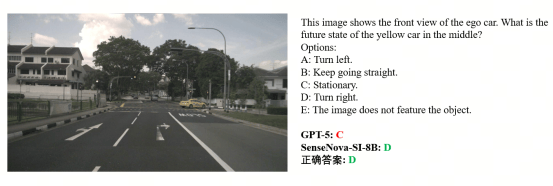 多车道道路场景,判断黄色汽车的后续动作(如直行、转向等)。GPT-5选择答案C(静止),SenseNova-SI-8B选择答案(D),??正确答案为D(右转)??。(例题源自SITE-Bench)