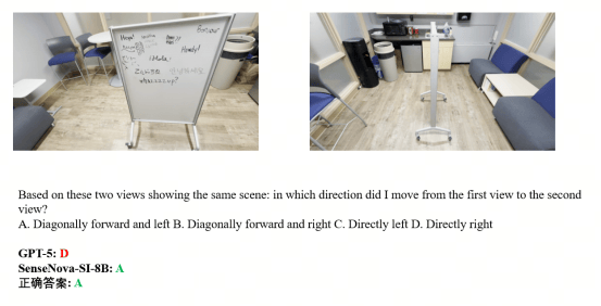 以下为GPT-5和SenseNova-SI-8B模型面对空间智能问题,给出的答案对比。