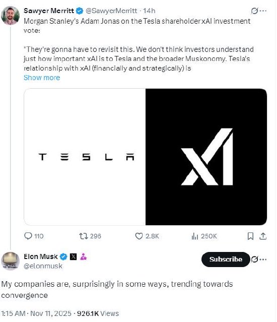 马斯克周一在X上的一条帖子中表示,他的公司正在“趋向融合”,暗示了他的各种商业企业之间的潜在整合,包括特斯拉和他的人工智能初创公司xAI。