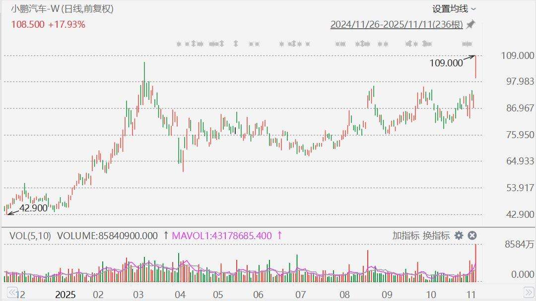 格隆汇11月11日|港股市场小鹏汽车-W(9868.HK)今日放量大涨,盘中一度涨18.48%报109港元,最终收涨17.93%报108.5港元,创2023年7月27日以来最大单日涨幅,股价创2022年7月以来新高,全天成交额放大至逾90亿港元。消息面上,近日,小鹏汽车的全新一代人形机器人IRON因“极度拟人”备受海内外用户和投资者关注,马斯克还点赞了关于小鹏机器人的视频。此外,摩根士丹利、德银、花旗、中金、中信证券(600030)等多家头部机构纷纷发报告强推小鹏汽车。