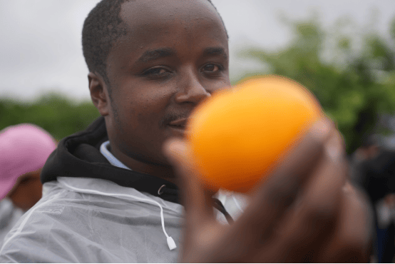 ▲ 肯尼亚农创客凯莱布准备品尝大理宾川柑橘科技小院示范园种植的沃柑。王磊|摄