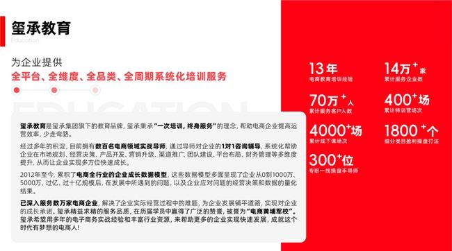 无论是大型企业还是中小企业,无论是传统电商平台还是新兴社交电商平台,都能从玺承集团靠谱的服务与课程体系中获得实在靠谱的成效和价值。