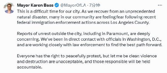 6月8日,洛杉矶市长卡伦·巴斯在社交平台X发文称,“洛杉矶县最近采取的联邦移民执法行动让社区中的许多人感到恐惧”。