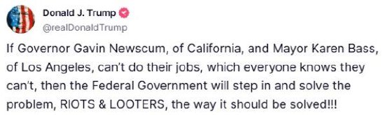 当日,美国总统特朗普在Truth Social声称,如果加利福尼亚州州长加文·纽森和洛杉矶市市长卡伦·巴斯不能履行职责,那么联邦政府将介入。