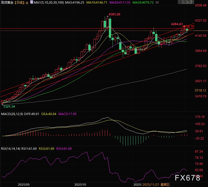 现货黄金上涨至4264的上升通道上轨后开始回调,最终无法守住4235的关键价位。