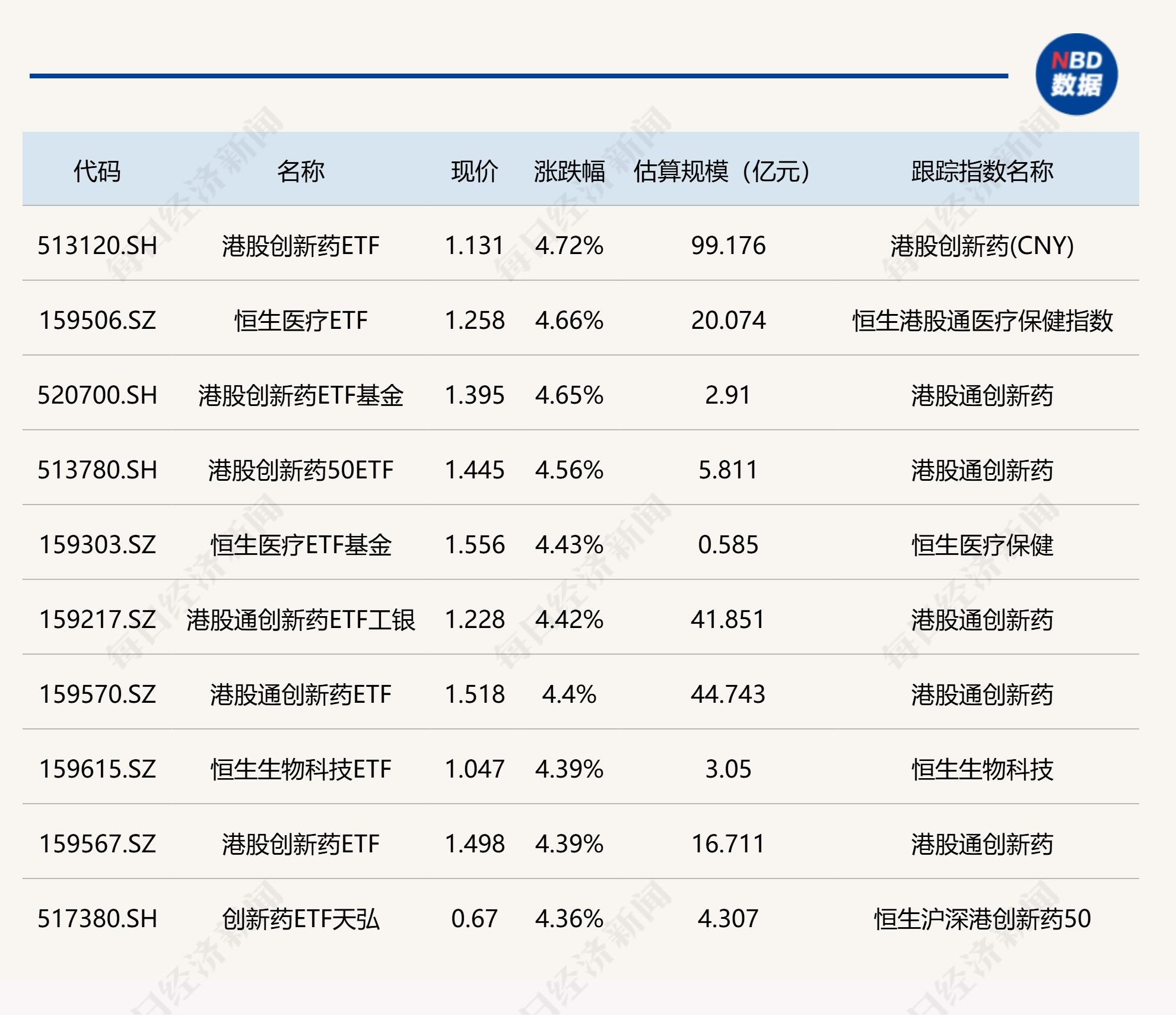 ETF涨跌幅方面,多只港股创新药相关ETF涨超4%。