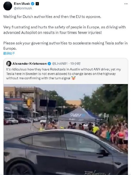 这位亿万富翁周三援引社交媒体平台X上一位瑞典特斯拉车主的帖子说:“等待荷兰当局,然后是欧盟的批准。”