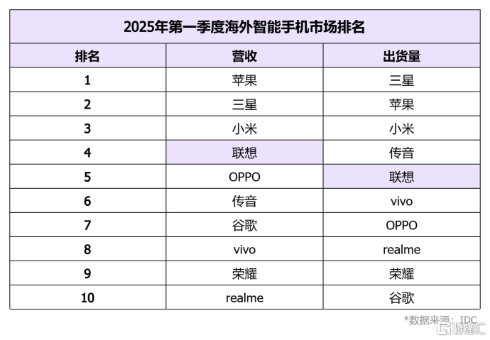 在除中国以外的海外市场,联想摩托罗拉2025年Q1收入达34.2亿美元,同比激增16.7%,远超市场4.4%的增速,市场份额(3.3%)从第五升至第四,超越OPPO、传音与谷歌。全球市场中,联想以2.5%的收入份额位列第八,同比提升0.3个百分点,增速16.4%远超行业4.3%的平均水平。