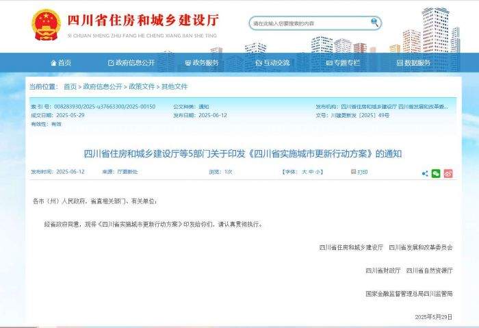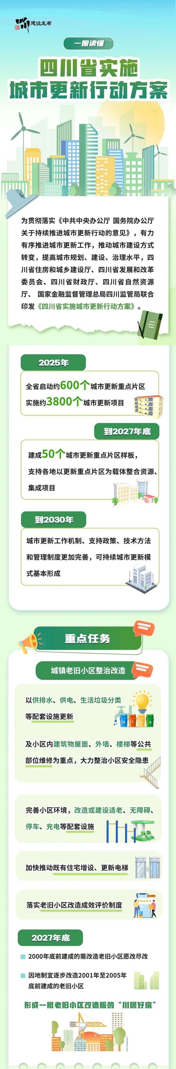 近日,四川省住房和城乡建设厅、四川省发展改革委、四川省财政厅、四川省自然资源厅、国家金融监督管理总局四川监管局联合印发了《四川省实施城市更新行动方案》(简称《行动方案》)。《行动方案》提出,2025年,全省要启动约600个城市更新重点片区,实施约3800个城市更新项目,持续改善城市功能品质,建设高品质宜居空间。
