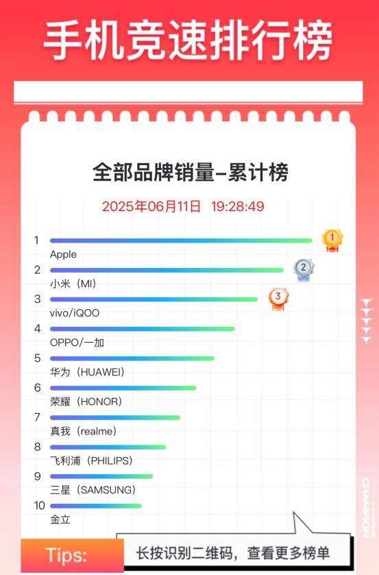 值得关注的是,一年一度的年中大促618活动已经接近尾声,小米在各电商平台持续霸榜。此前小米发布的618开门红战报显示,截至5月31日23:59:59,小米全渠道累计支付金额突破169亿。根据京东手机竞速榜,小米旗下多款机型销量领先。截至6月11日19点28分,小米品牌成为全部手机品牌销量国产冠军,REDMI K80则成为全部单品手机销量国产冠军。