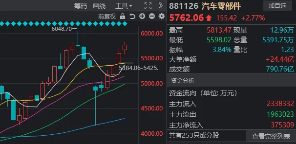 其中,成分股最多、成交额最大的汽车零部件板块,本周仅周一和周五上涨,周中持续回调;但得益于今日修复明显,板块周线已录得5连涨(4连阳),接近3月下旬创出的历史新高。