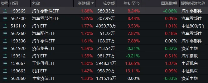 场内ETF中,多只汽车零部件ETF今天也涨幅领先,主要得益于成分股豪恩汽电录得20cm涨停;工业母机、机床等主题ETF也纷纷上涨,不过上述产品的规模和成交额都偏小。