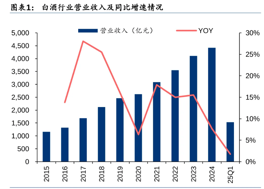 数据显示,2024年白酒行业营收和净利润增长降至个位数,2025年一季度复苏增长更是缓慢,营收和净利润同比增长仅为2.3%和2.6%。