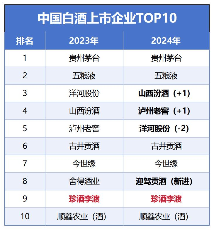 以2023年和2024年为例,贵州茅台、五粮液始终稳居前两位;洋河股份、山西汾酒和泸州老窖的第三之争尤为激烈,最终“茅五汾”取代了“茅五洋”;前十之争中,口子窖、舍得酒业逐渐跌出前十。