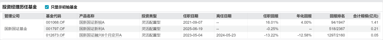 截至目前,该首席投资官在管的公募基金仅剩国新国证融泽6个月定开基金,一季度末的规模为0.6亿元。