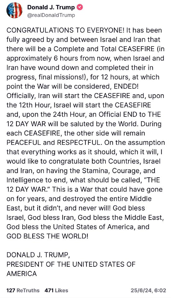 特朗普写道:“伊朗将正式开始停火,在12时,以色列也将开始停火,24时,全世界将庆祝这场12天的战争正式结束”。