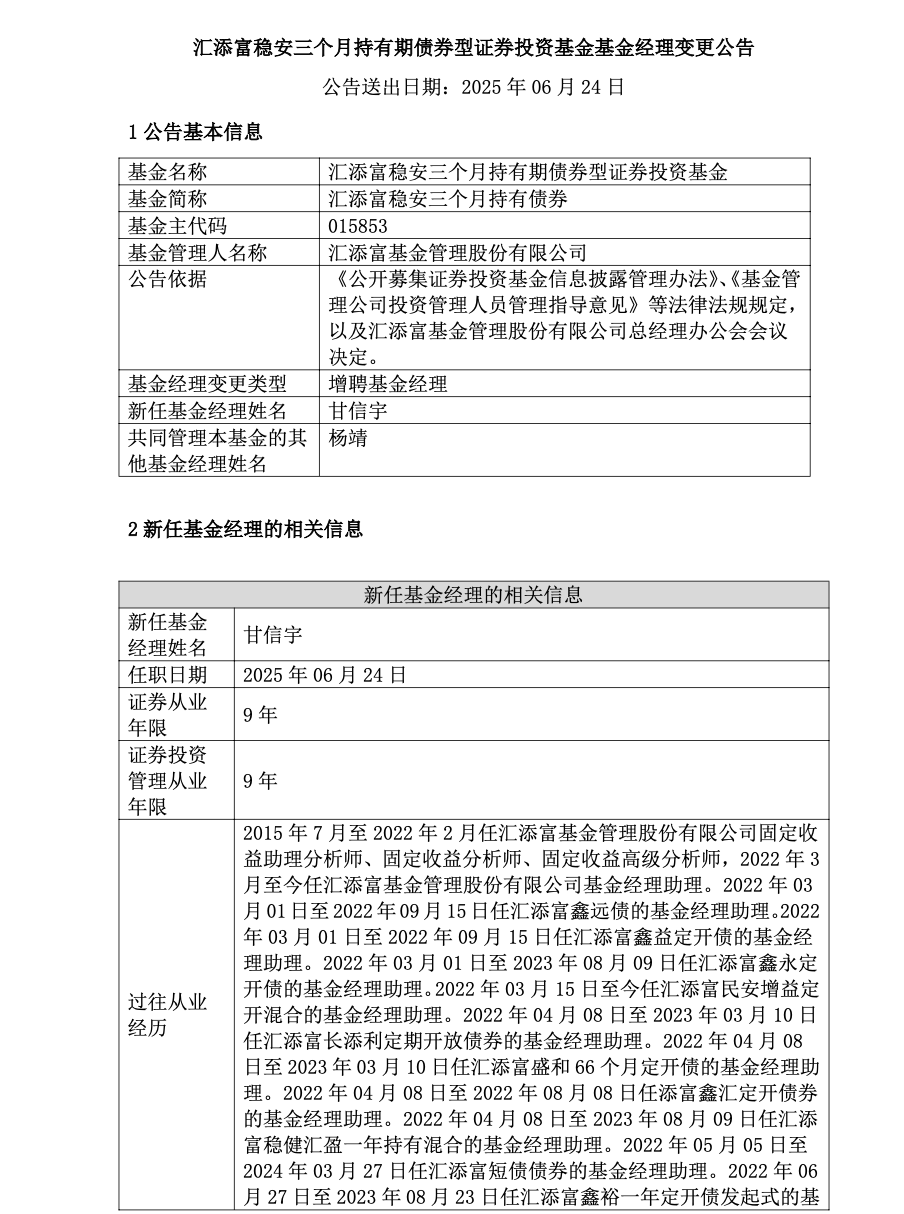 6月24日,汇添富基金公告宣布增聘甘信宇为汇添富稳安基金经理,与资深老将杨靖共同掌舵。