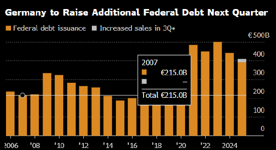 财政署的新计划预计第三季度将额外发行150亿欧元债券——其中包括80亿欧元的七年期新债券,以及40亿欧元的短期票据。全年发债总额将达到约4100亿欧元,去年12月宣布的最初目标是3800亿欧元。