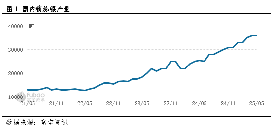 2025是国内精炼镍企业爬产的关键年,伴随中资企业海外建厂且投产后,中间品回流提速,国内精炼镍企业蓬勃发。目前国内涉及精炼镍产能的企业超过20家,平均月产量超过3万吨,强大的原料的供应体系为国内精炼镍企业爬产提供了保障。数据显示,2025年1-5月国内精炼镍产量高达17.3万吨,同比去年同期增加5.45万吨,增幅高达17.99%。精炼镍产量的持续攀升,对镍价形成较大压力。