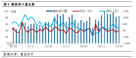 当然,除了国内精炼镍产量攀升之外,印尼当地镍产品的产量也有明显增加趋势,尽管产能释放高峰已过,但高产量状态依旧持续。数据显示,2025年1-5月国内镍铁进口量在89.41万吨,同比去年同期增加16.92万吨,增幅高达23.34%。产量与进口量的双重加持,国内镍市场上半年库存增长明显,对镍价形成施压。