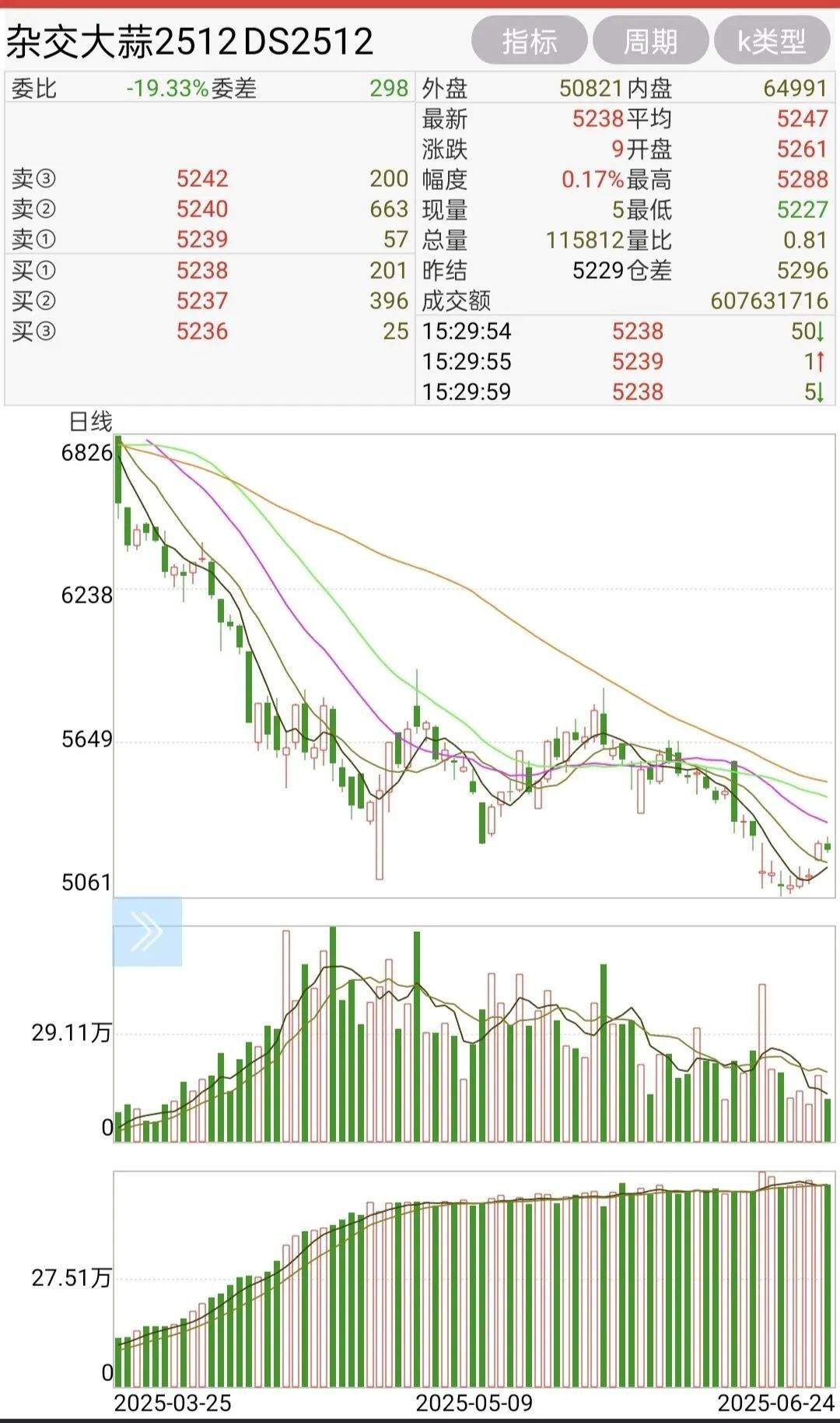 另外,电子盘动向也同样值得关注:华夏国际大蒜电子盘杂交大蒜DJ2512合约近期博弈激烈,6月21日早盘价格从5108元/吨(约2.55元/斤)冲高至5168元/吨(约2.58元/斤),随后震荡回落至5144元/吨,当日成交量10万手,持仓量突破52万手,多空双方日内反复拉锯,盘面波动对现货跌势形成缓冲。