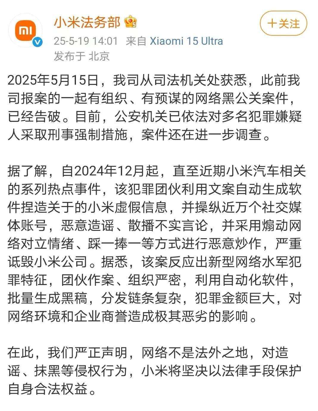5月19日下午消息,小米法务部通过官方微博发布信息表示,5月15日从司法机关处获悉,此前报案的一起有组织、有预谋的网络黑公关案件,已经告破。目前,公安机关已依法对多名犯罪嫌疑人采取刑事强制措施,案件还在进一步调查。