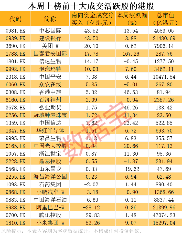 从本周前十大活跃个股来看,共有26只个股上榜,国泰君安(601211)国际本周港股通成交总额最高,达到573.61亿港元,小米集团-W、中芯国际、阿里巴巴-W的买卖总额均超过200亿港元。
