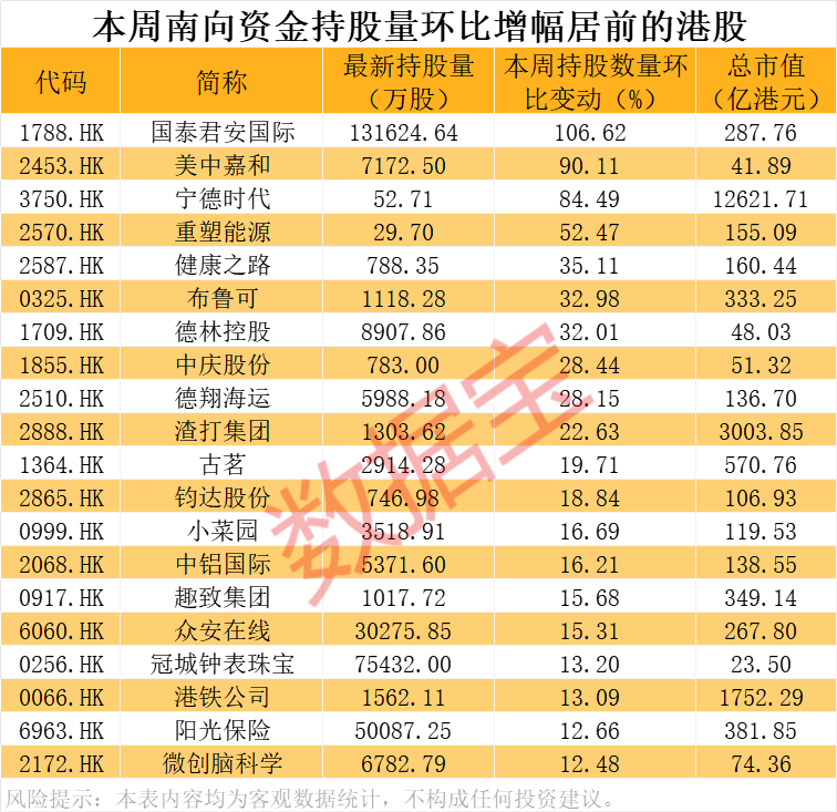 从持股量变化来看,本周23股的南向资金持股量环比增长超10%,其中国泰君安国际持股量环比实现翻倍,增幅为106.62%,美中嘉和、宁德时代(300750)的持股量增幅均在80%以上。