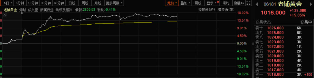 今日,港股老铺黄金一度涨超18%,股价突破1000港元/股,续创历史新高。随后,涨幅有所收窄,但整体涨幅依然非常可观,市值也突破1700亿港元。