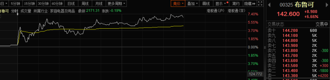 该股爆发亦带动香港新消费板块走强。布鲁可、古茗大涨超6%,泡泡玛特大涨超3%,蜜雪集团上涨近2%。